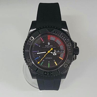 Relax PVD Black Stainless Steel Watch Rubber Strap Black Calendar Seiko NH35 Automatic Movement